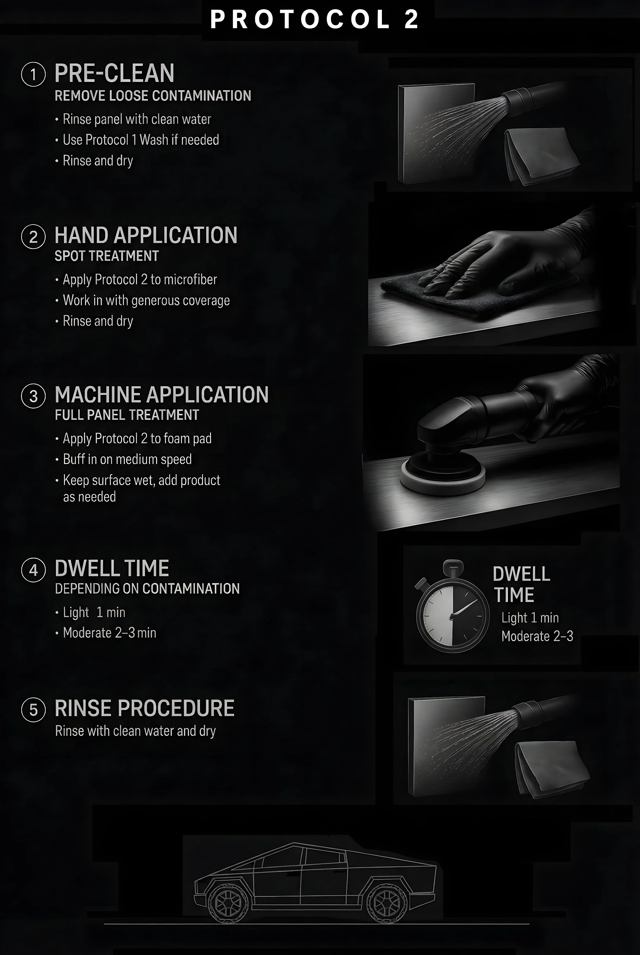 Protocol 2 removes bonded contamination that conventional washing does not eliminate — including mineral deposits, environmental films, industrial fallout, surface discoloration, and early-stage rouging.